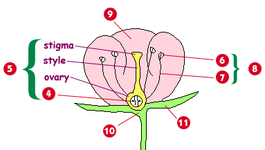 En alttan başlayacak olursak ; 10 numara ile gösterilen yeşil bölge çiçeğin tabanını oluşturmaktadır.Üremede bir rolü yoktur.11 numara ile gösterilen bölge bu tabanın yapraklarıdır.4 numara ile gösterilen kısım çiçeğin dişi üreme organıdır (ovaryum).6 numara ile gösterilen yapılar erkek üreme organlarıdır (anter).7 numara ile gösterilen yapı ise anter'in sapıdır ve "Filament" adını alır.Son olarakta 9 numara ile gösterilen yapı çiçeğin güzel renklere sahip yapraklarıdırki bu sayede böcekleri üstüne çeker.
