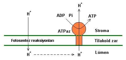 Stromadan plastokinon (PQH) ' a gelen hidrojen, yine plastokinon üzerinden lümene geçer.Plastokinon burada H (+) iyonunu ileten bir mekik görevi üstlenmiştir.H (+) iyonları lümene geçtikten sonra aşağıdaki şekilde gösterildiği gibi ATP sentezlenir.