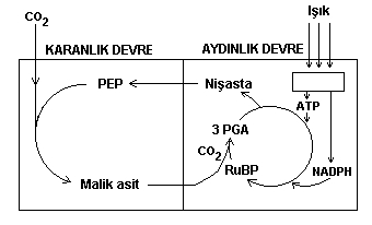 Gündüzleri ise stomaları kapar ve bu nedenle artık hücrelere CO2 girişi durur.Fakat bitki CO2 gazını malik asiti parçalayarak elde eder.NADP, malik asiti dekarboksile eder ve NADPH ' a dönüşür.Malik asit dekarboksile olurken hem yapısındaki CO2 yi serbest bırakır hemde pirüvik asite dönüşür.