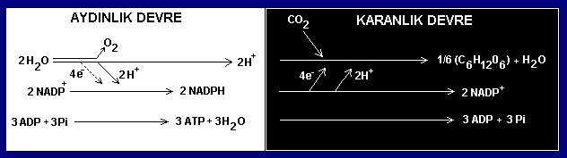 Fotosentez denklemlerini " Işık tepkimesi " ve " Karanlık tepkimesi " olmak üzere en sade haliyle aşağıdaki şekildeki gibi özetleyebiliriz.