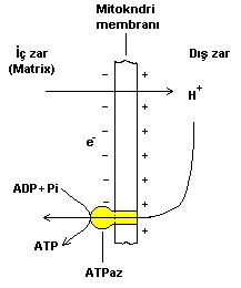 Bu elektrik gradiyenti H(+) iyonlarının mitokondri zarından tekrar matriks içerisine girmesine neden olur.Fakat H(+) iyonu, zarın içerisine gömülü olan kanal şeklindeki ATPaz enziminin içerisinden geçer. Bu geçiş esnasında ADP (Adenin tri fosfat) molekülü yapısına bir tane daha fosfor (P) bağlayarak ATP (Adenin tri fosfat) ' ye dönüşür.ADP den ATP sentezini gerçekleştiren enzim ise ATPaz dır.Bu enzim, membrana bağlı bir protein olup zarın bir yüzünden diğer yüzüne kadar uzanır.