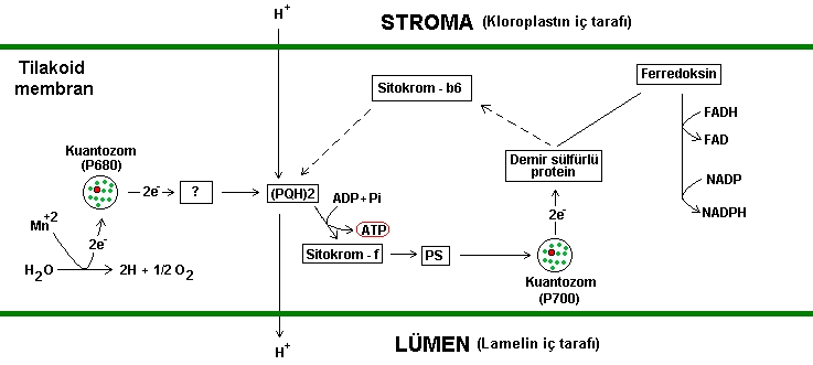 Elektronlar bu molekül üzerinden " Plastokinon (PQH) " ' a gelir.Plastokinon kendini redükte etmek için stromadan yani tilakoid membranının dış tarafından yada diğer bir deyimiyle kloroplastın iç tarafından H (+) iyonunu alır.Elektronlar plastokinondan çıktıktan sonra Sitokrom - f ' ye giderken ATP senezine katılır.Sitokfom - f ye gelen elektron ardından merkezinde P700 molekülü bulunan diğer kuantozoma gelir (Bu kuantozomda fotosistem 1 dir).Fotosistem 1 e ulaşan elektronlar buradan, yapısında demir ve sülfür bulunduran protein kompleksine gelir.Elektronların buradan sonra izleyebileceği iki yol vardır.