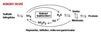 SO4 (-2) iyonları, bazen doğada serbest olarak reaksiyona girerek sülfatlı bileşikleride verebilirler.Organizmalar tarafından alındığı takdirde kükürt içerene iki amino asit olan Sistein ve Metionin ' nin yapılarına katılırlar (Bkz.Biyokimya-1 sayfası, amino asit tablosu). Karbon devri :