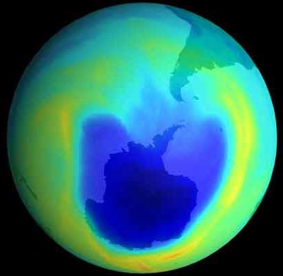 Mavi olarak görülen bölge atmosferin koruyucu katmanlarından birisi olan ozon tabakasındaki deliğin ne kadar genişlediğini açık bir şekilde göstermektedir.Ozon tabakasının delinmesine neden olan en önemli faktör, uçakların jet motorlarından çıkan egsoz gazları ve yaygın olarak soğutma cihazlarında ve deodorantlarda kullanılan itici gazlardır.