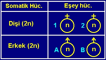 Dişinin somatik hücrelerinde " 1 - 2 " genlerini taşıdığını varsayarsak, dişinin " 1 " genetik yapılı eşey hücresiyle erkeğin herhangi bir eşey hücresinin birleşmesi halinde meydana gelecek yavrunun DNA sı ya " 1 - A " olacak yada " 1 - B " olacaktır.