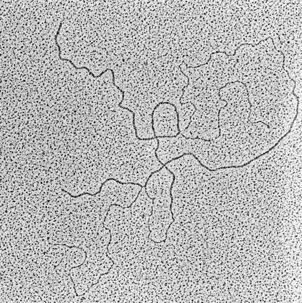Sagdaki resimde ise DNA ipliğinin dönümler yaparak paketlenmiş hali görülmektedir (birisi solda birisi sağda iki karmaşık yapı).İşte DNA nın bu şekilde paketlenmiş haline " Kromozom " adı verilir.