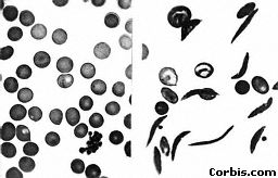 Soldaki resimde görülen hucreler disk seklindeki normal alyuvar (eritrosit) hücreleridir.Fakat kanserli bir insanın kan hücreleri "orak" sekline dönüşmüştür.