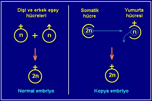 Sol tarafta ise klonlama yöntemi görülmektedir.Klonlama yönteminde ilk olarak dişi bireyin somatik hücrelerinde bulunan 2n sayıdaki kromozom, özel yöntemlerle hücre dışarısına çıkarılır ve izole edilir.Daha sonra yine dişi bir bireyin yumurta hücresinin n kromzom sayıdaki genetik materyali çıkarılır.