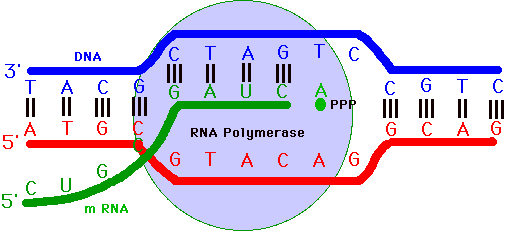 DNA çözülmeye başladıkça "RNA polimeraz" adı verilen özel bir protein DNA nın üzerinde gezerek onu okumaya ve RNA yı sentezlemeye başlar.Bu işlemi daha iyi anlamak icin aşagıdaki şekle bakalım.