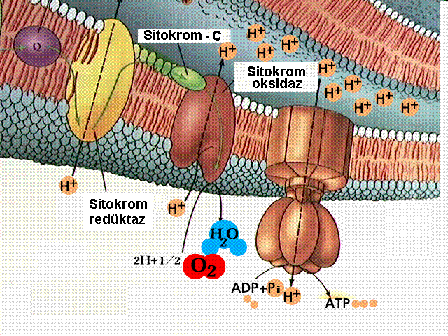 Bu enzimler belirli molekülleri yapılarına alıp okside edebilir veyahut bu moleküllerden H (+) iyonu koparabilirler.Koparılan elektron ve protonlar mitokondri matriksi içerisinde dolanarak kimyasal basamaklara girerler.Şeklin sağ tarafında mitokondri matriksinden bir proton sitoplazmaya verilmekte, aynı zamanda ADP (Adenin di fosfat) ' ye bir fosfat daha bağlanarak ATP (Adenin tri fosfat) meydana getirilmektedir.