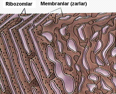 Hücrenin nasıl ki çevresini kuşatan bir zarı var ise hücre içerisindeki her organelinde çevresini kuşatan kendine özgü bir birim zarı vardır.Şekilde endoplazmik retikulumun kıvrımlı yapısı göz önüne alınarak zarların hangi tarafının göründüğü belirtilmiştir.