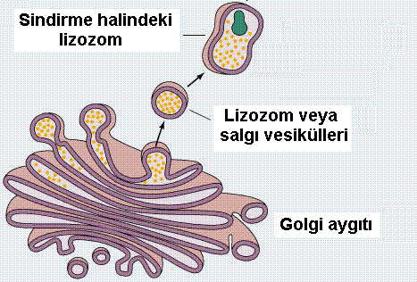 Sindirici enzim içeren vesiküllere ise " Lizozom " adı verilir.Lizozomların içerdikleri sindirici enzimlerin pH ' ı çok düşüktür ve asidik yapıya sahiptir.İçerdikleri bu asidik tabiattaki sıvılarla hücre içerisine alınan besin maddelerini tıpkı midemiz gibi sindirmeye başlarlar.Lizozomlar aynı zamanda hücre içerisinde fonksiyonlarını yitirmek üzere olan yaşlanmış organelleride bünyelerine alarak eritip yok ederler.