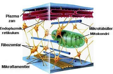 Hücrenin % 75 ' lik kısımının su olduğunu belirtmiştik.İçerisinde bu kadar fazla miktarda su ihtiva eden bir yapının dağılmadan ayakta durabilmesi, hücre içerisindeki iskelet ve tıpkı kaslar gibi hareket eden bir tür sistem sayesinde mümkün olmaktadır.