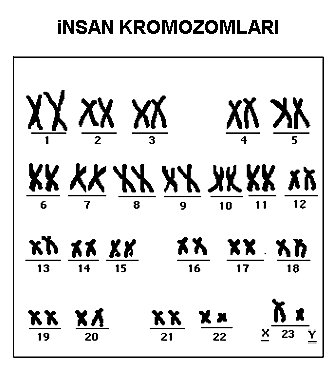 Sağdaki şekilde elektron mikroskobuyla fotoğrafı çekilen kromozomların soldaki şekilde sınıflandırılmış şekli görülüyor.