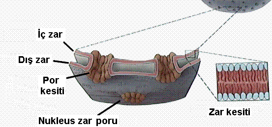 Görüldüğü gibi nukleus zarıda iki tabakadan oluşmaktadır.Bu tabakalardan birisi nukleusun içerisine diğeri ise sitoplazmaya bakmaktadır.