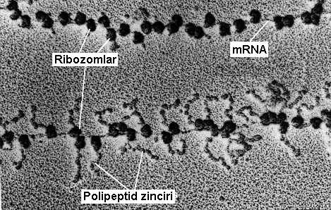 Ribozomlar tıpkı bir boncuk dizisi gibi yanyana dizilmişlerdir.Biraz zor farkedilen mRNA ise bir ribozomdan çıkıp diğer bir ribozoma ardı ardına girmektedir.Resmin sağ tarafındaki protein zinciri sol tarafındaki protein zincirlerinden daha uzundur.