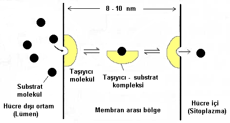 Şekilde, hücre zarının enine kesitini görmektesiniz.Zarın içinde moleküllerin bir taraftan diğer tarafa transferini sağlayan taşıyıcı molekül görlülüyor.Bu moleküller, taşınması zor olan ve difüzyon (yayınma) yoluyla geçemeyen büyük molekülleri ATP enerjisi kullanarak hücre içerisine veya hücre dışarısına taşırlar.