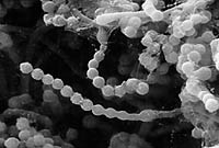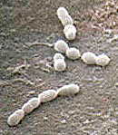 En sağdaki resimde ise bir " Kok (Coccus) " bakterisi görmektesiniz.Bu bakterilerin şekli ise küre gibidir.Fakat resimde tesbih taneleri gibi dizili bir koloni görülüyor.Bakterilerin bu şekilde sıralanıp koloni oluşturmasına ise