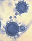 Soldaki resimde bir mantar spor hücresini, sağdaki resimde ise tıpkı bakteriler gibi koloni kurmuş bir mantar hücre grubunu görmektesiniz.Bu canlılarda tıpkı diğer mikroorganizmalar gibi denizel ve karasal ekolojik dengelerin korunmasına yardımcı olmaktadırlar. Parazitler :